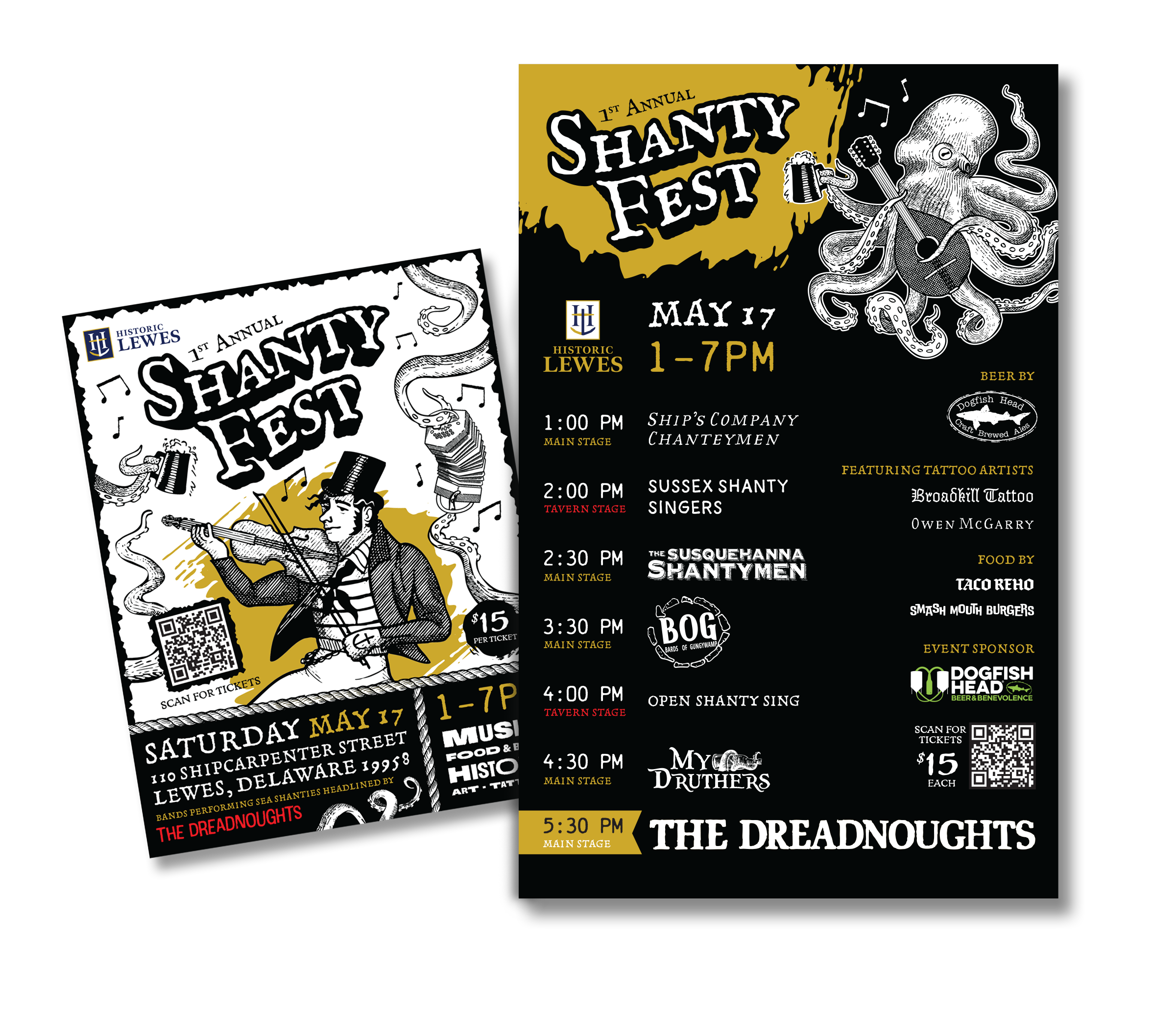 Create custom event branding, of course! Historic Lewes held their 1st Annual Shanty Fest that celebrated the maritime traditions of Lewes, Delaware, with music, art, and history. Illustrations & typography were inspired by 18th century maritime artwork.